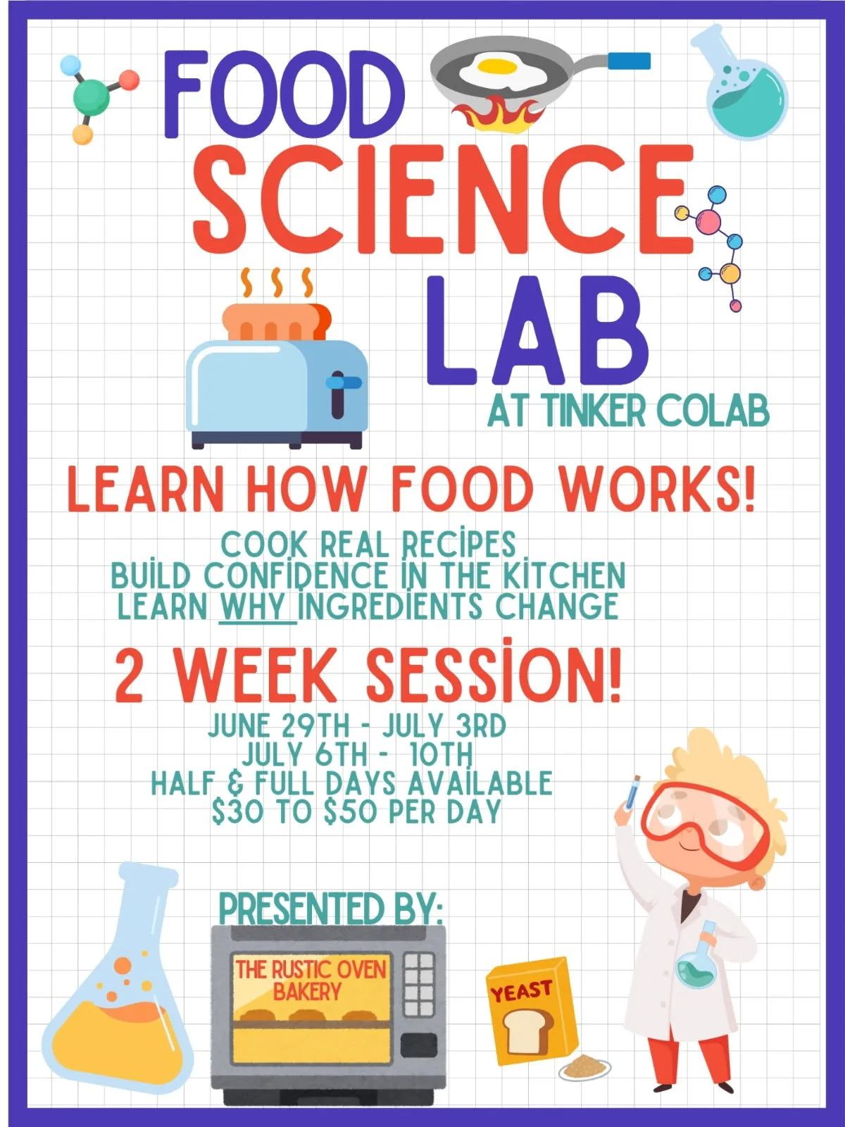 Tinker Food Science Camp is a hands-on summer experience where kids cook, bake, and explore the science behind food in a real kitchen environment. Through daily experiments and real recipes, they learn how ingredients transform while building confidence and practical life skills. This camp also supports our Learning Kitchen Project and Tinker Impact Fund, helping expand access to meaningful, community-based education.